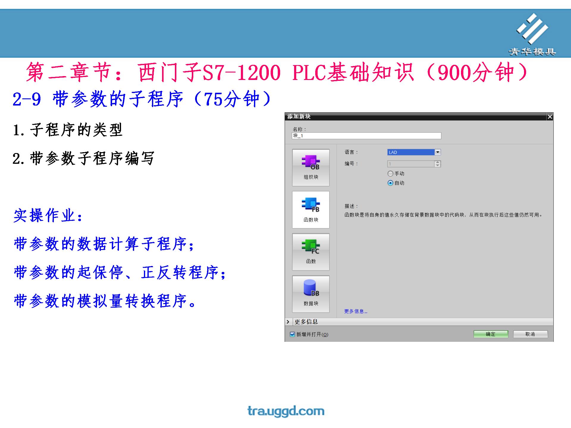 • 首页>课程大纲 >PLC编程>PLC编程第一阶段 >2-9 带参数的子程序